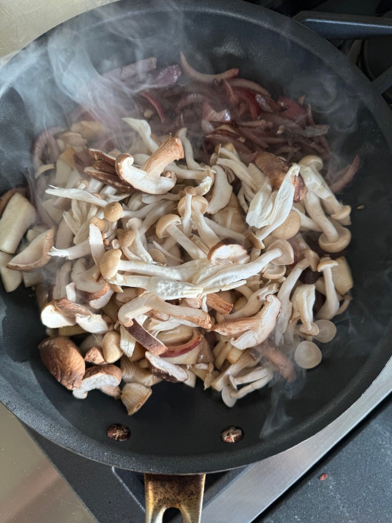 במחבת רחבה מטגנים את הבצל בשמן-זית. כשהבצל מתרכך מעט, מוסיפים את הפטריות, מתבלים במעט מלח וממשיכים בערבוב תוך כדי בישול. מתבלים בנדיבות בתבלין השווארמה (מתכון בהמשך) וממשיכים לטגן בערבוב עד שהפטריות מתרככות. מוסיפים את האגוזים ומערבבים היטב. טועמים ומתקנים תיבול.