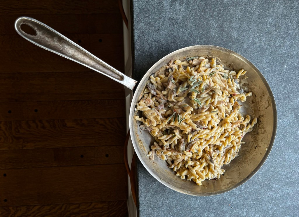 מעבירים את הפסטה לרוטב, מוסיפים מעט ממי הבישול לפי הצורך ומערבבים היטב.