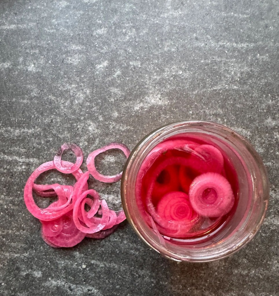 * אם במקרה יש במקרר סלק, מוסיפים פרוסה קטנה לצנצנת ומקבלים בצלים בורוד זרחני