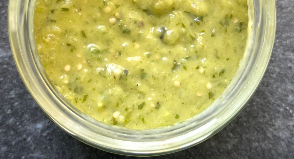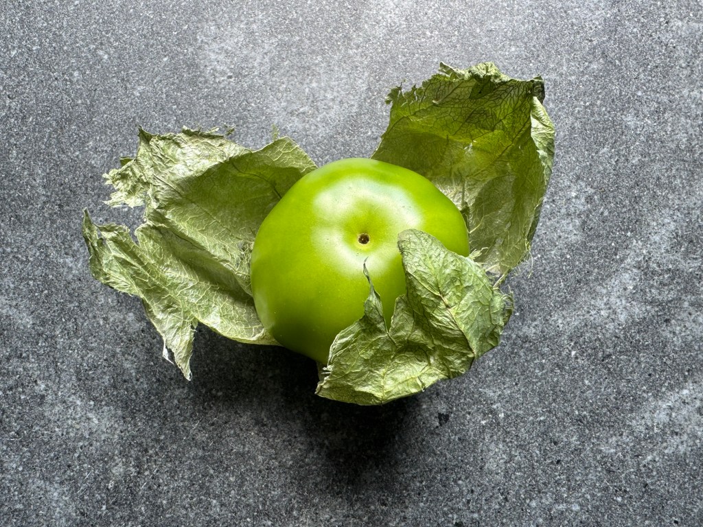 קולפים את הטומטילו, חוצים וצולים אותם כדקותיים על מחבת יבשה וחמה בכדי לצרוב אותם מעט.