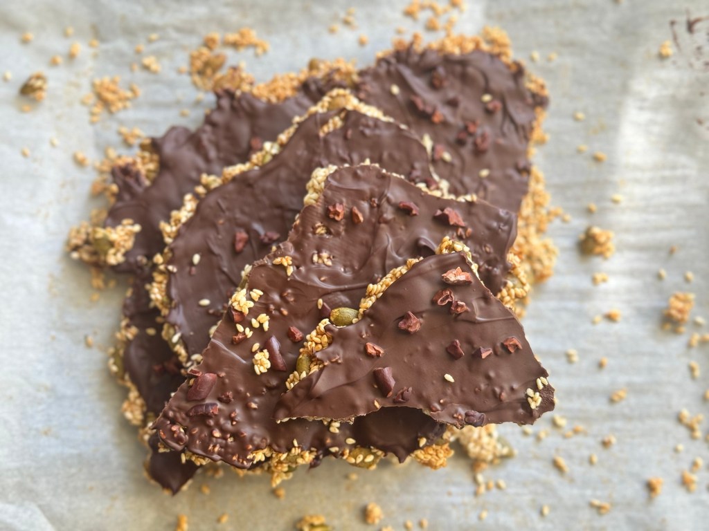 להמיס את השוקולד ומרוח או להזליף מעל. אם בא לפזר שברי פולי קקאו מעל- זה הזמן. לקרר לחלוטין (במקרר זה מצוין) ולשבור לפיסות.