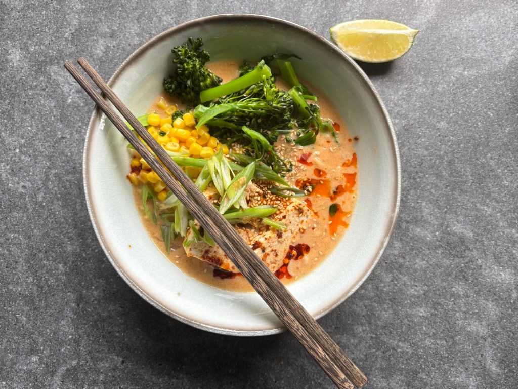 מרכיבים– מחלקים את הנודלס לשתי קערות עמוקות ומוזגים מן המרק הרותח. מניחים מעל את הברוקוליני, התירס ופרוסות הטופו. מפזרים מעל קצת בצל ירוק ושומשום ומגישים עם שמן צ׳ילי