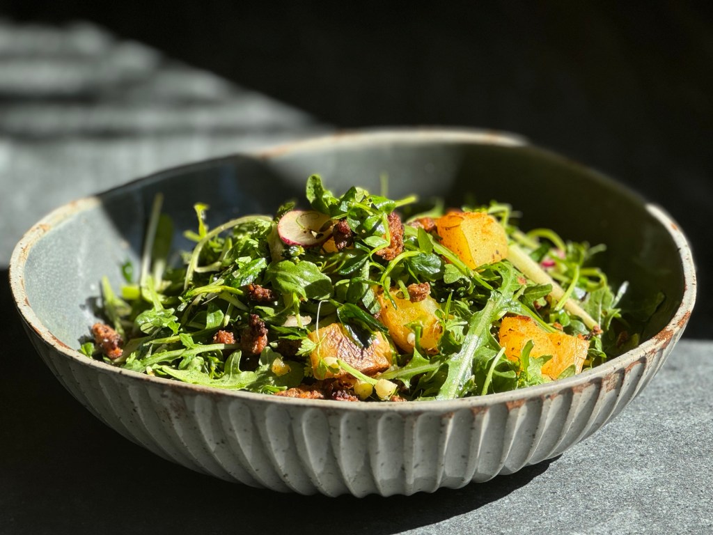 – סלט ירוקים עם צנוניות, תירס טרי, טרגון וקוביות תפוחי אדמה צלויים בשמן-זית (בתמונה)