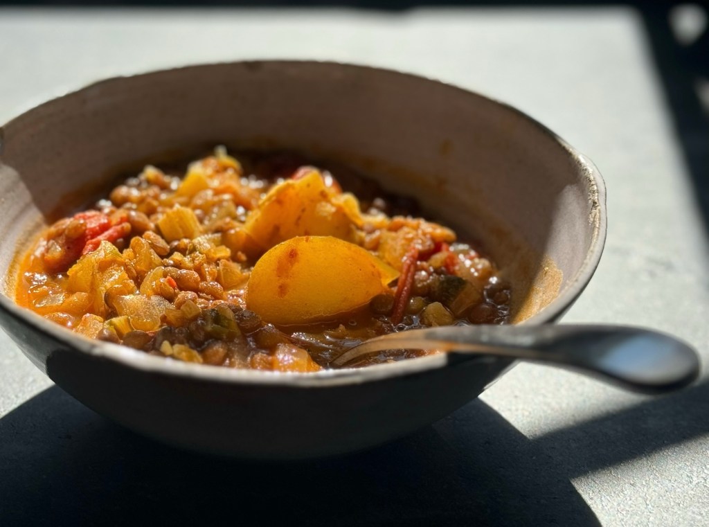 במעט שמן זית מזהיבים את הבצל. מוסיפים את השום והתבלינים ומטגנים יחד מעט. מוסיפים את העדשים, תפוחי האדמה, העגבניות הקצוצות וחלב הקוקוס ומערבבים היטב. מתבלים היטב במלח ובפלפל ומוסיפים בערך כוס- כוס וחצי של מים. מביאים לרתיחה ומבשלים מכוסה על להבה נמוכה, עם ערבוב אגבי של פה ושם, כשעה. כמות הנוזלים שתוסיפו תקבע האם בזה מרק או בתבשיל. כשתפוחי האדמה והעדשים רכים מאד, טועמים ומתקנים תיבול אם חסר.