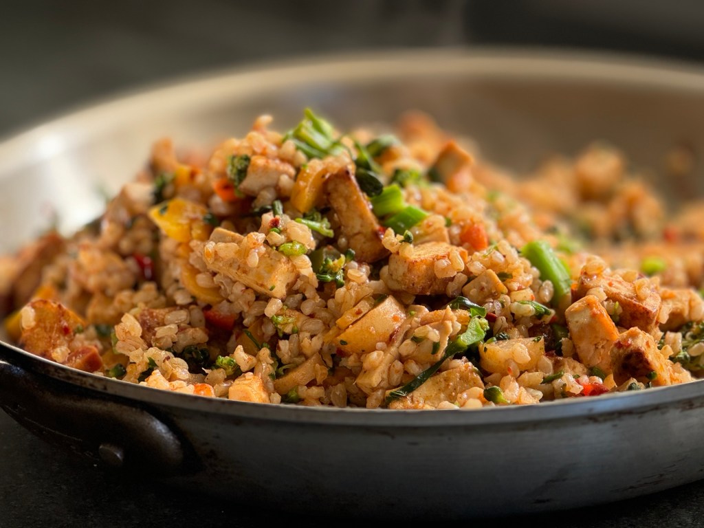 מוסיפים למחבת את הירקות ורבע כוס מים בכדי שדבר לא יישרף. מוסיפים את האורז והטופו, מתבלים בסויה ובשמן צ׳ילי ומערבבים היטב. טועמים ומתקנים תיבול