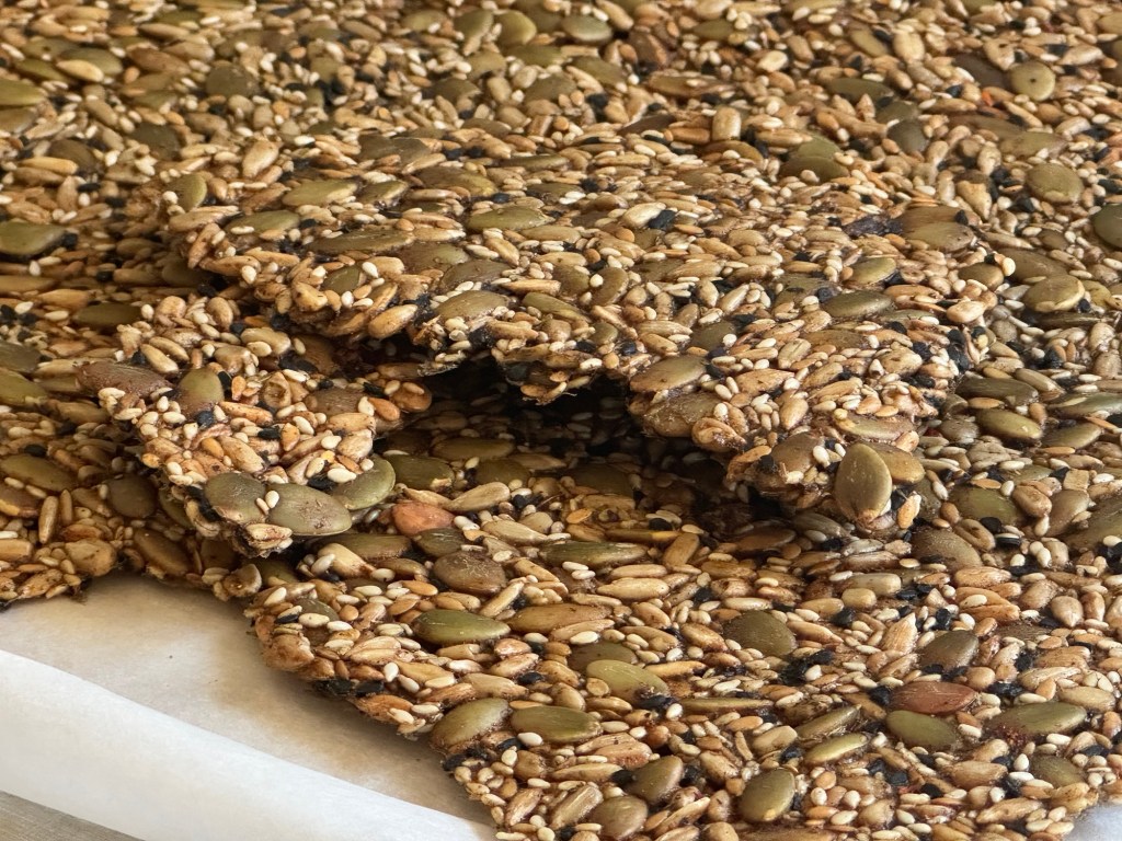 אופים כשעה- במהלכה, לאחר כ-40 דקות, אני הופכת את המשטח כך שיתאם היטב מכל צד. תלוי בתנור, לפעמים צריך פחות זמן אפיה. חשוב לייבש מאד בכדי שהקרקרים יישמרו היטב.