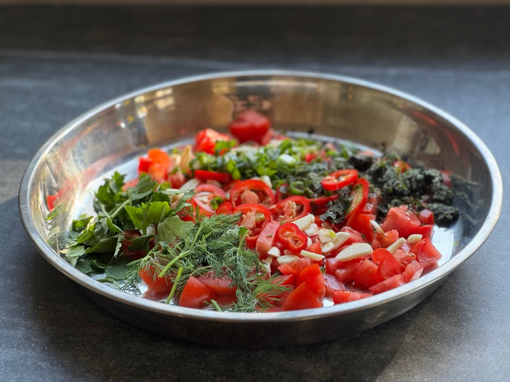 חופן קצוץ גס מכל אחד- בזיליקום, פטרוזיליה, שמיר