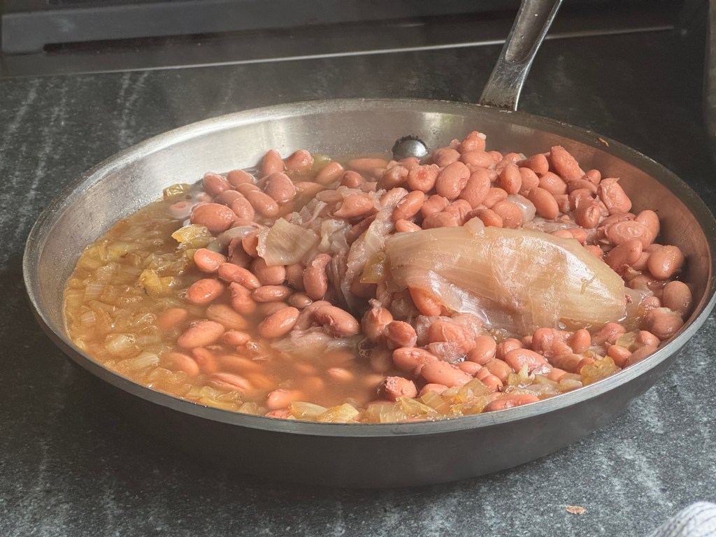 שעועית פינטו מבושלת לרכות מופלאה עם בצל ואז מבושלת שוב עם בצל מטוגן ומעט תבלינים.
