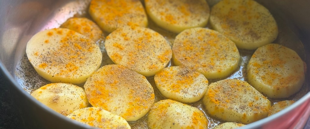 מזליפים שמן-זית בנדיבות לסיר רחב ומפדרים במלח ופלפל. פורסים את תפוחי האדמה, מרפדים את תחתית הסיר ומתבלים בעוד קצת מלח ופלפל ובמחצית משאר התבלינים. פורסים דק את הבצל/כרישה ומניחים מעל. מזליפים מעט שמן ומתבלים שוב.