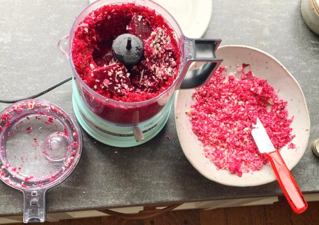 במקום הסכין של מעבד המזון מרכיבים את דיסקית הפומפיה הדקה. מגררים את הסלקים.