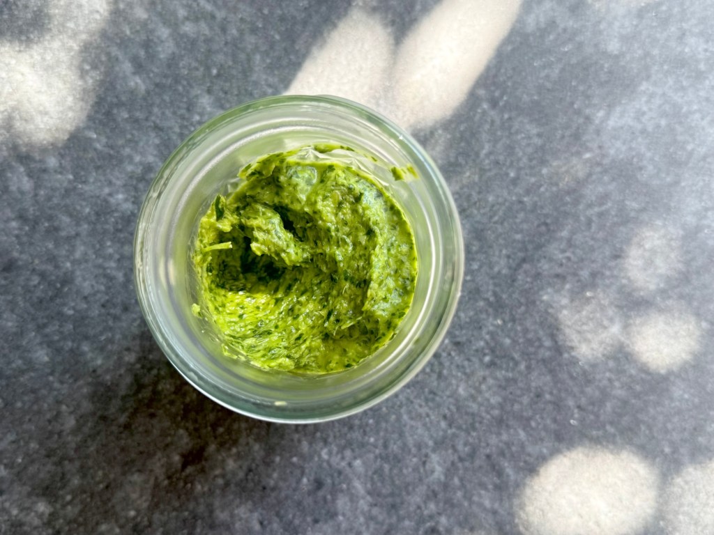 כשהכל קצוץ דק-דק, מוסיפים את השמן וטוחנים עד לקבלת משחה סמיכה ואחידה.