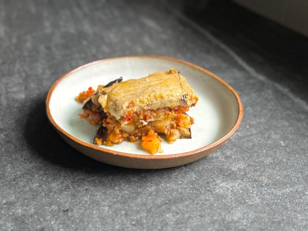 שכבות של חצילים, תפוחי-אדמה, עדשים ובשמל, ארוחה נימוחה ומדושנת, חגיגית אפילו.
