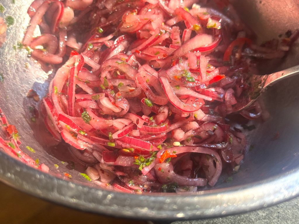 מעבירים לקערה, מפדרים במלח ולשים מעט יחד בכדי לרכך את הבצל. מוסיפים את שאר המרכיבים, מערבבים ונותנים לבצל לנוח עם החברים כ- 20 דקות. מוכן!