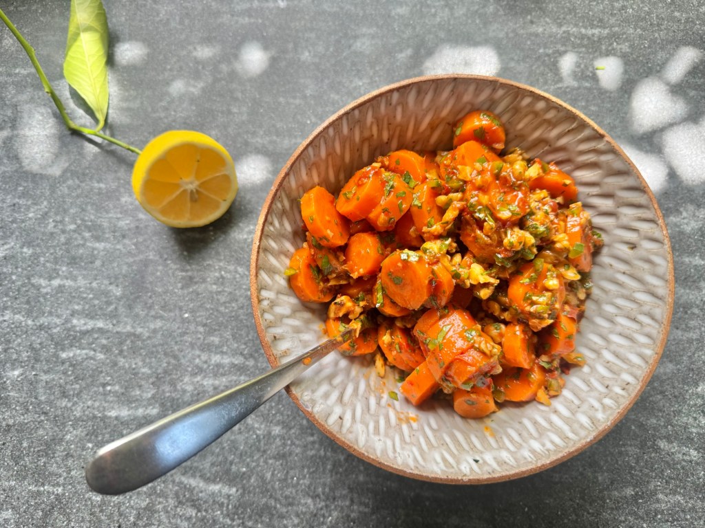 מניחים את הגזרים בסיר עם מים והרבה מלח, מביאים לרתיחה ומבשלים כעשר דקות. הגזרים ריקים להיות עדיין נגישים ולא רכים לגמרי. שוטפים במים קרים, חותכים לטבעות של כ-1/2 ס”מ ומעבירים לקערה.