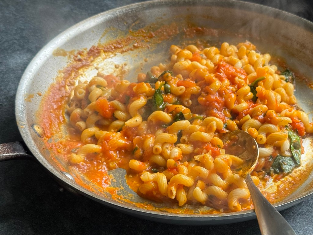 במחבת עצמה- מועכים את העגבניות והשום בעזרת מועך פירה מוסיפים עשבי תיבול, לימון כבוש, עלי תרד וחוויאג’, וממשיכים לבשל בבעבוע עליז. עד שהפסטה מוכנה, הרוטב סמיך, אדום ומוכן