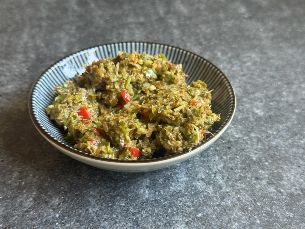 מכניסים את עלי הגפן והשום למעבד מזון קטן וטוחנים היטב יחד. מוסיפים את שלושת סוגי הצ׳ילי והעשבים ומתבלים בעדינות. טוחנים יחד עד שהכל קצוץ טוב, לא משחתי. מעבירים לצנצנת ומכסים בשמן-זית.