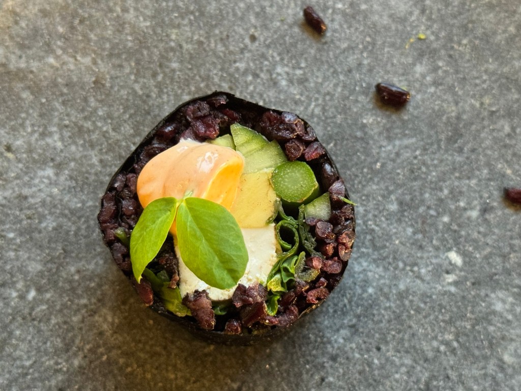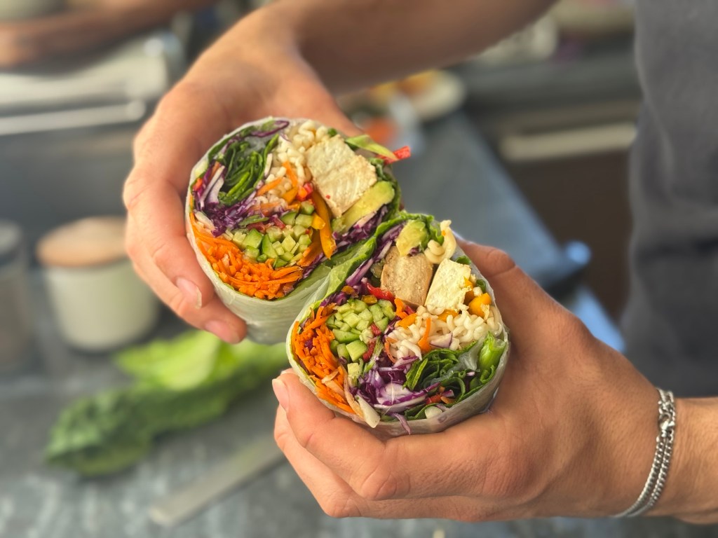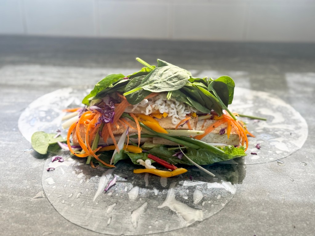כל ירק שמתחשק יכול להכנס פנימה בתנאי שהוא פרוס דק מאד. כאן יש בנוסף לטופו- כרוב סגול, גזר, פלפל צהוב, בצל ירוק, מלפפון, אבוקדו, תרד וחסה.