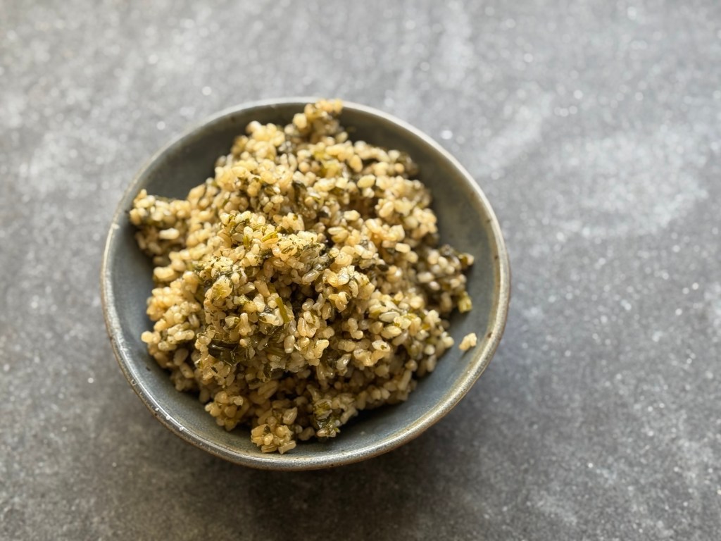קוצצים את כל העשבים ומערבבים עם האורז המסונן + 2 כפיות מלח.