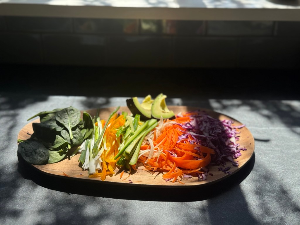 אפשר להוסיף לכאן גם – גזר וגמבה פרוסים דק, כרוב סגול, נבטים- מה שבא ומה שיש
