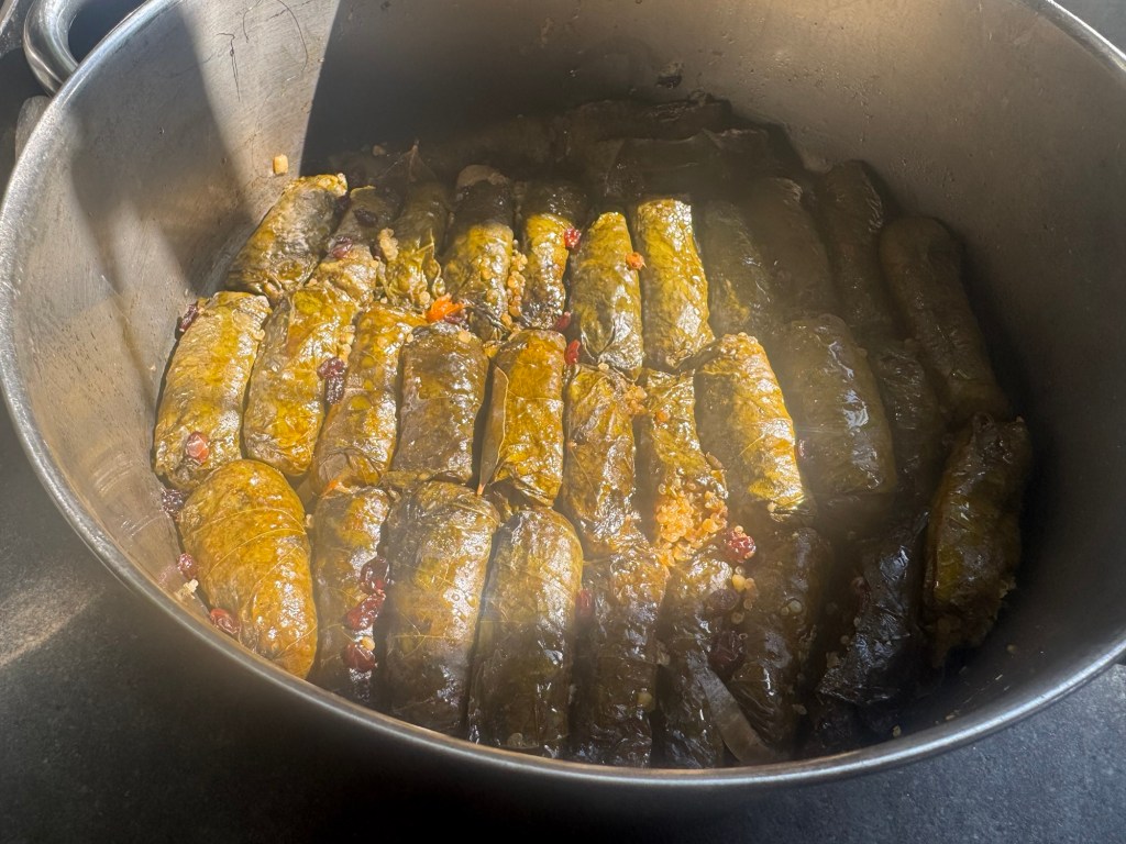 מניחים צלחת מעל לעלי הגפן בכדי שלא יצופו ויִבלגנו במהלך תחילת הבישול. מביאים באיטיות לרתיחה, מנמיכים את הלהבה וממשיכים לבשל מכוסה, תוך בעבוע עדין כשעה. את הצלחת ניתן להסיר לאחר כחצי שעה, אחרי שהקינואה ספחה את המים ועלי הגפן התמקמו בנוחות, זה גם הזמן לסדר אותם במקומם בדחיפות עדינות. זילוף שמן-זית מוסיף המון. ומעט זרשק, רק אם יש.