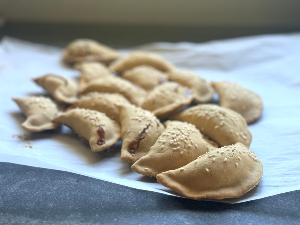 מרימים את העיגול בכדי לוודא שהבצק משוחרר מהמשטח, מרטיבים קלות חלק משולי עיגול הבצק , עורמים מעל כף גדושה מאד של מלית, מקפלים לחצי ומהדקים את הדפנות יחד.מניחים את המאפים על גבי נייר אפיה ואופים כ- 20 דקות.