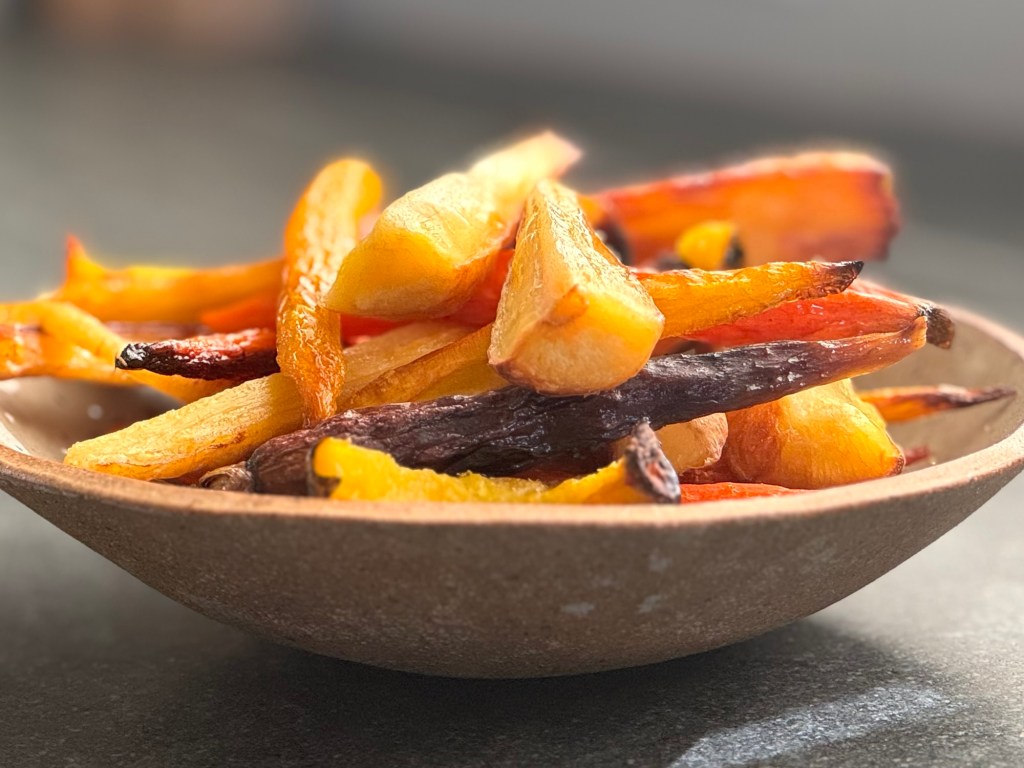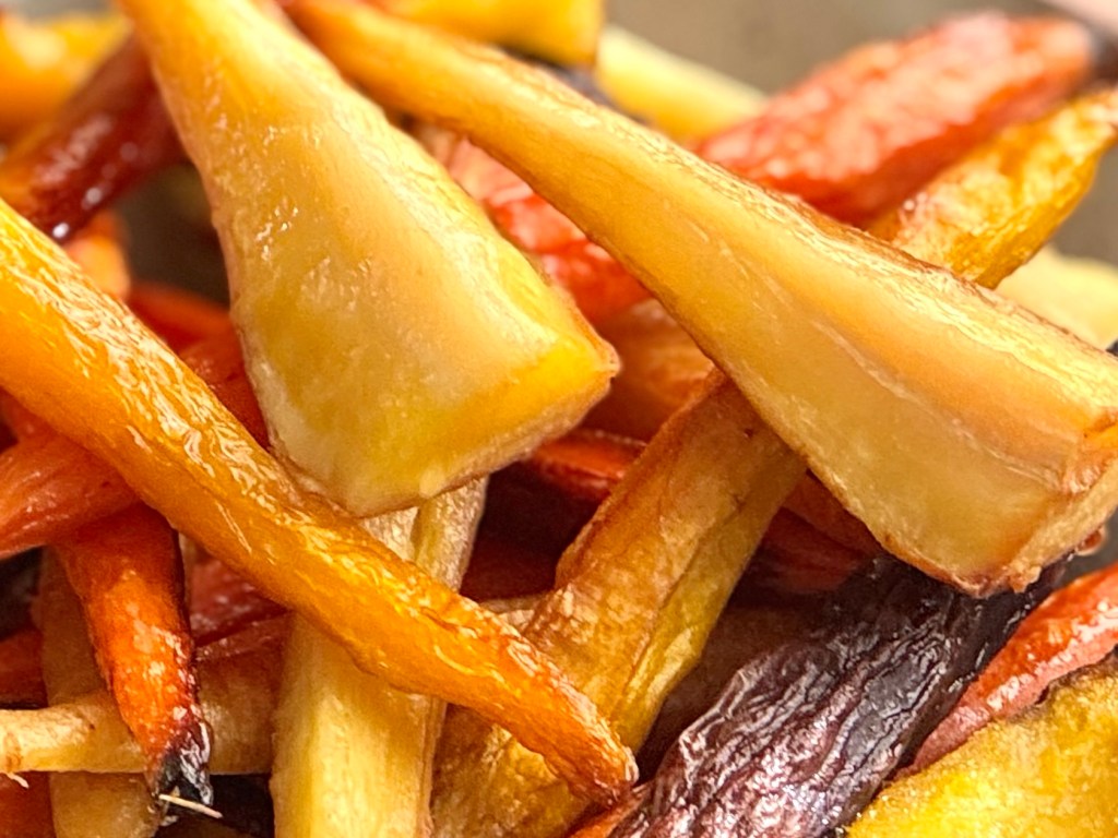 חותכים את תפוחי האדמה לרבעים ואת הגזר והשורש פורסים דק, בכדי שיתרככו בערך באותו זמן.